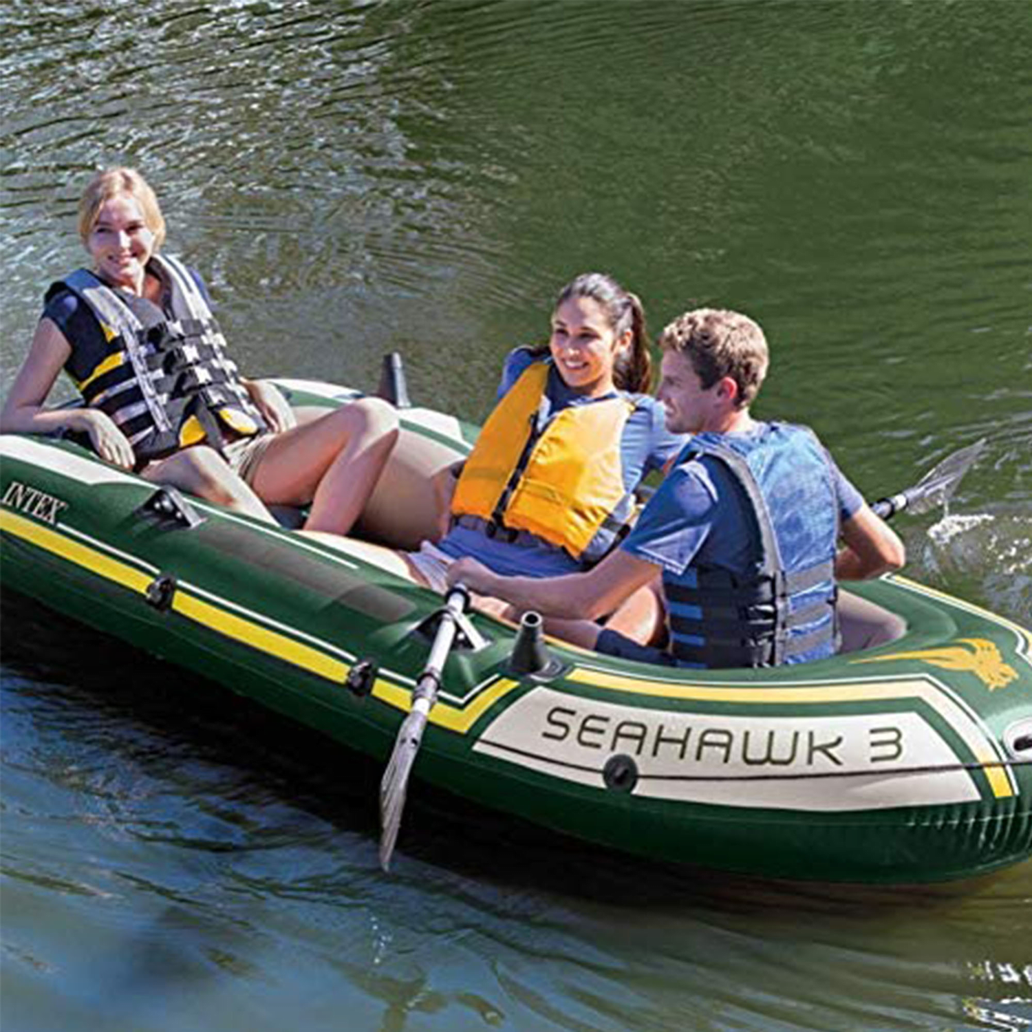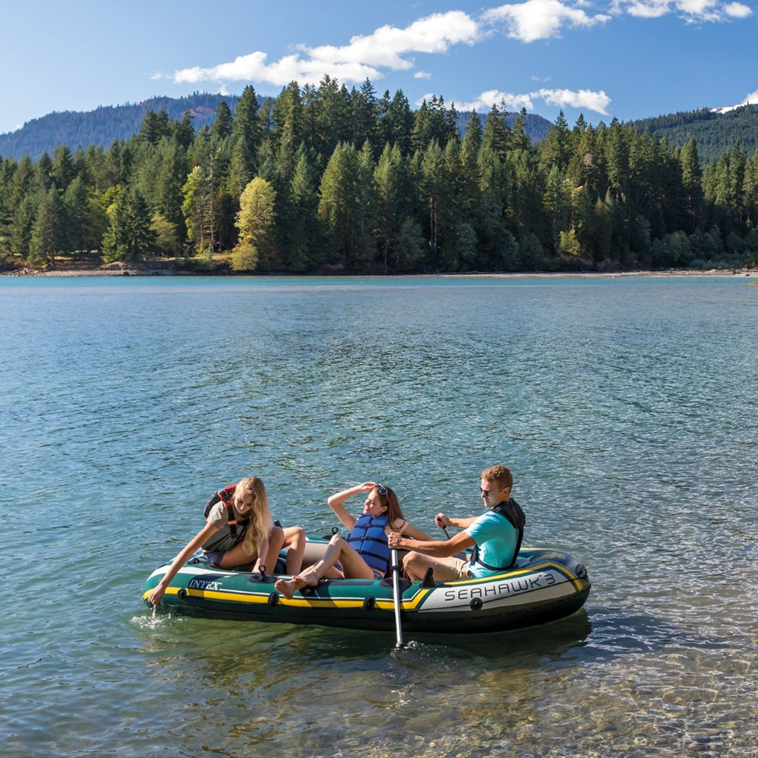 Il canotto Seahawk™ 3 è perfetto per pesca, relax o remate su fiumi, laghi e mare. Con 3 camere d’aria (una ausiliaria) per sicurezza e galleggiabilità. Realizzato in PVC resistente e vinile triplo strato per durata e comfort. Pavimento gonfiabile con trave a "I" per rigidità.